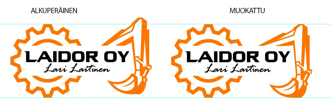 Laidor Oy tarvitsi pientä jeesiä logon muokkaamisessa. Kuulemma kaivurin puomi olisi kiva saada tasan viereisen rattaan kanssa. Tämä onnistui kivasti laskemalla kauhaa alaspäin ja muokkaamalla puomin kulmaa. Logosta oli useampi versio eri värisillä taustoilla, joten muokattu logo toimitettiin saman näköisillä versioilla.